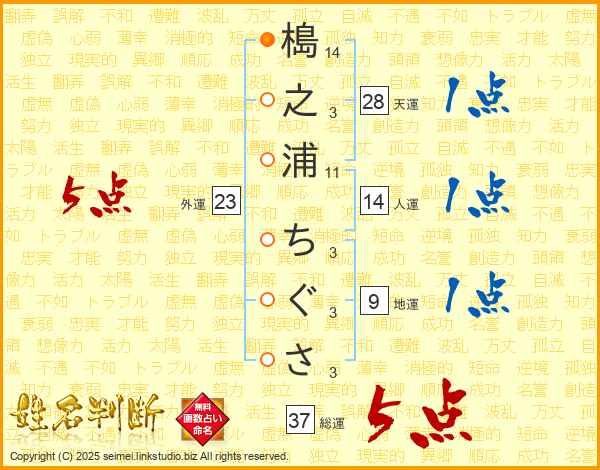生活面を象徴する運勢です。外部から受ける影響力を表し、結婚運、家庭運や職場、環境への順応性を表します。総運から人運を引いた画数。姓や名が1文字の場合を除く。