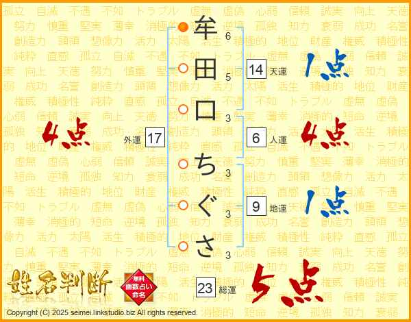 生活面を象徴する運勢です。外部から受ける影響力を表し、結婚運、家庭運や職場、環境への順応性を表します。総運から人運を引いた画数。姓や名が1文字の場合を除く。