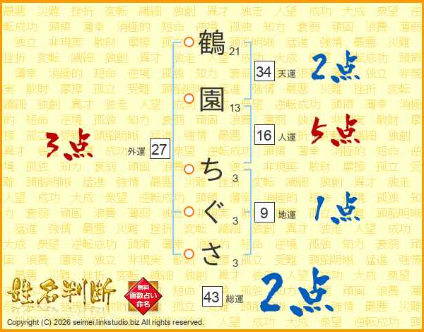 鶴(21画)園(13画) ち(3画)ぐ(3画)さ(3画)