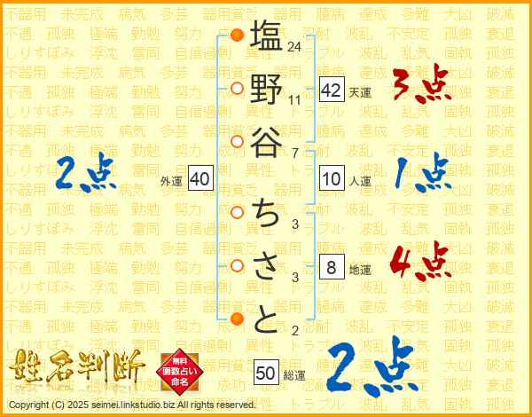 生活面を象徴する運勢です。外部から受ける影響力を表し、結婚運、家庭運や職場、環境への順応性を表します。総運から人運を引いた画数。姓や名が1文字の場合を除く。