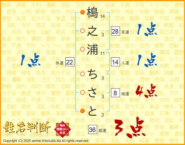 生活面を象徴する運勢です。外部から受ける影響力を表し、結婚運、家庭運や職場、環境への順応性を表します。総運から人運を引いた画数。姓や名が1文字の場合を除く。