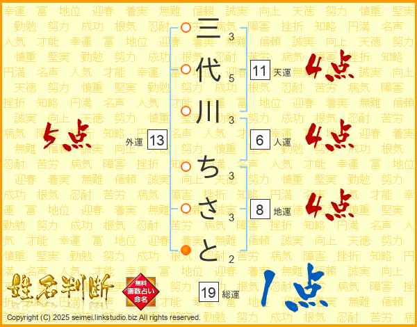 あなたの人生を表す1番重要な運勢です。生涯を通じて影響する総合運となり、主に50歳以降の晩年期に影響を及ぼします。苗字と名前の合計画数。