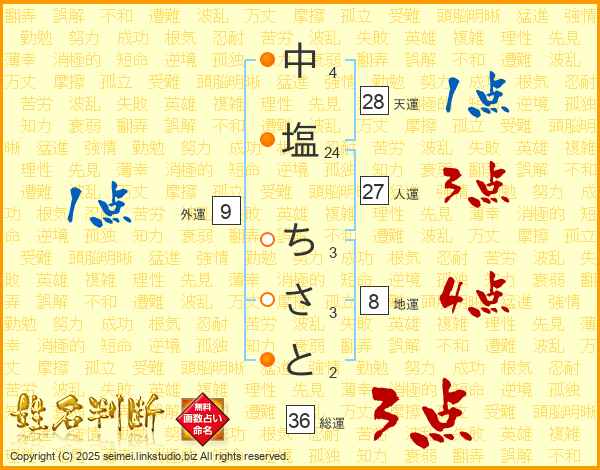 中(4画)塩(24画) ち(3画)さ(3画)と(2画)