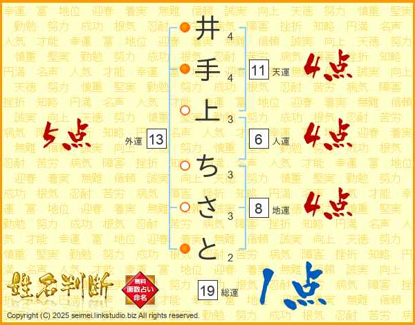 生活面を象徴する運勢です。外部から受ける影響力を表し、結婚運、家庭運や職場、環境への順応性を表します。総運から人運を引いた画数。姓や名が1文字の場合を除く。