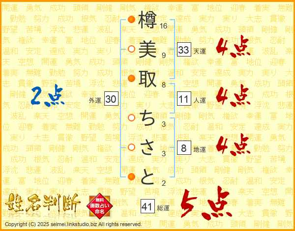 あなたの人生を表す1番重要な運勢です。生涯を通じて影響する総合運となり、主に50歳以降の晩年期に影響を及ぼします。苗字と名前の合計画数。