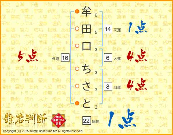 生活面を象徴する運勢です。外部から受ける影響力を表し、結婚運、家庭運や職場、環境への順応性を表します。総運から人運を引いた画数。姓や名が1文字の場合を除く。