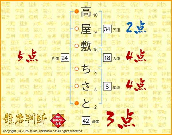 高屋敷ちさとさんの総運は42画の3点!