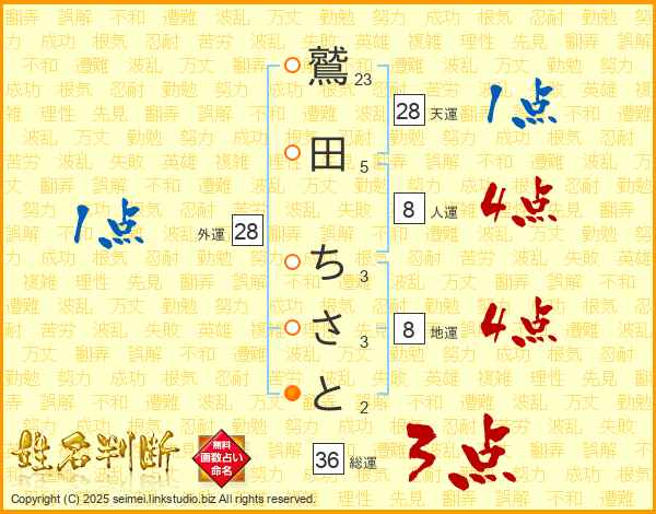 生活面を象徴する運勢です。外部から受ける影響力を表し、結婚運、家庭運や職場、環境への順応性を表します。総運から人運を引いた画数。姓や名が1文字の場合を除く。