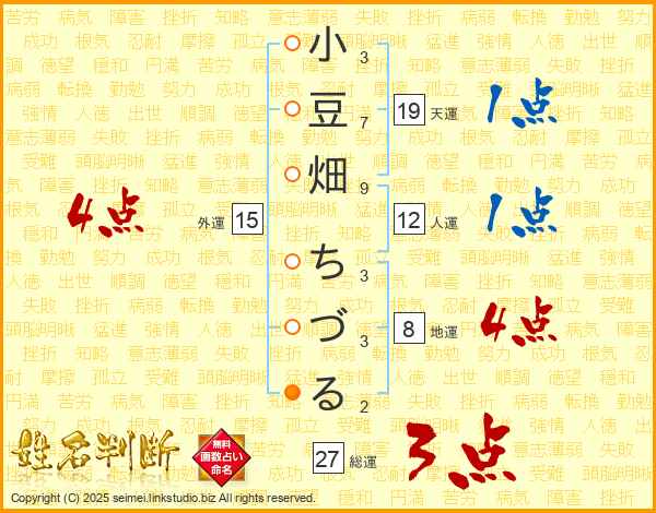 小(3画)豆(7画)畑(9画) ち(3画)づ(3画)る(2画)