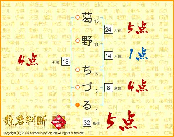 生活面を象徴する運勢です。外部から受ける影響力を表し、結婚運、家庭運や職場、環境への順応性を表します。総運から人運を引いた画数。姓や名が1文字の場合を除く。