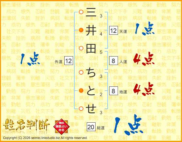 生活面を象徴する運勢です。外部から受ける影響力を表し、結婚運、家庭運や職場、環境への順応性を表します。総運から人運を引いた画数。姓や名が1文字の場合を除く。