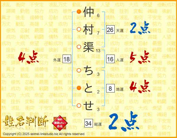 仲(6画)村(7画)渠(13画) ち(3画)と(2画)せ(3画)