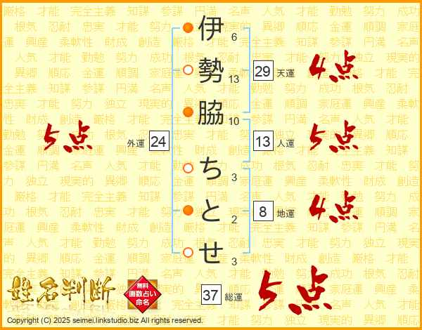 伊(6画)勢(13画)脇(10画) ち(3画)と(2画)せ(3画)