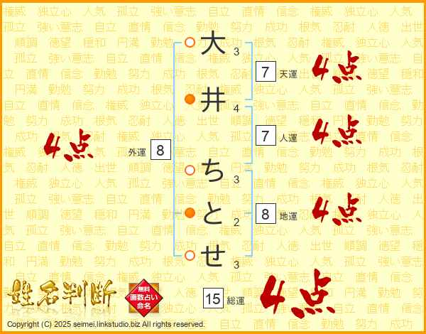 あなたの人生を表す1番重要な運勢です。生涯を通じて影響する総合運となり、主に50歳以降の晩年期に影響を及ぼします。苗字と名前の合計画数。