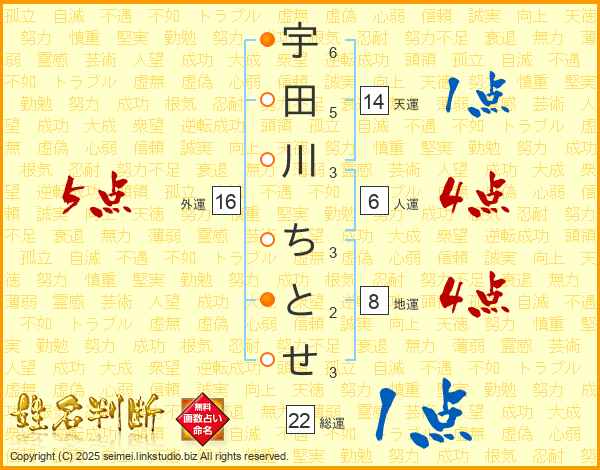 生活面を象徴する運勢です。外部から受ける影響力を表し、結婚運、家庭運や職場、環境への順応性を表します。総運から人運を引いた画数。姓や名が1文字の場合を除く。