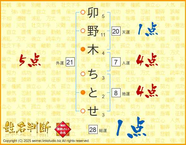 あなたの人生を表す1番重要な運勢です。生涯を通じて影響する総合運となり、主に50歳以降の晩年期に影響を及ぼします。苗字と名前の合計画数。