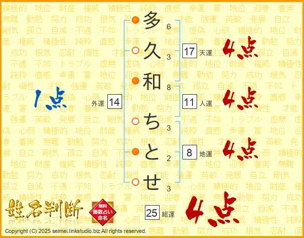 生活面を象徴する運勢です。外部から受ける影響力を表し、結婚運、家庭運や職場、環境への順応性を表します。総運から人運を引いた画数。姓や名が1文字の場合を除く。
