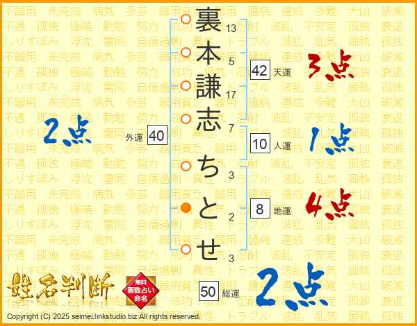 裏(13画)本(5画)謙(17画)志(7画) ち(3画)と(2画)せ(3画)