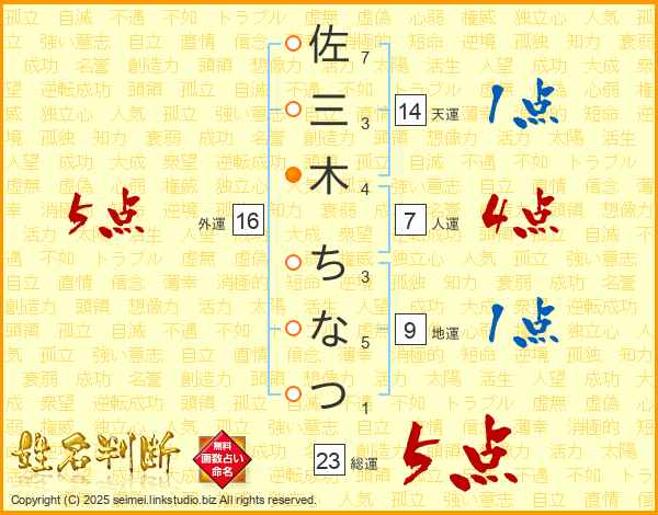 佐(7画)三(3画)木(4画) ち(3画)な(5画)つ(1画)