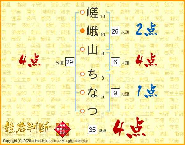 生活面を象徴する運勢です。外部から受ける影響力を表し、結婚運、家庭運や職場、環境への順応性を表します。総運から人運を引いた画数。姓や名が1文字の場合を除く。