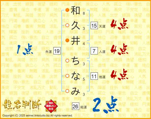 生活面を象徴する運勢です。外部から受ける影響力を表し、結婚運、家庭運や職場、環境への順応性を表します。総運から人運を引いた画数。姓や名が1文字の場合を除く。
