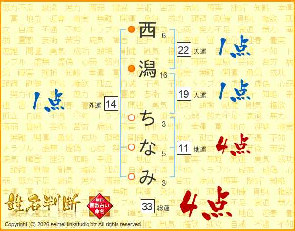 西(6画)潟(16画) ち(3画)な(5画)み(3画)