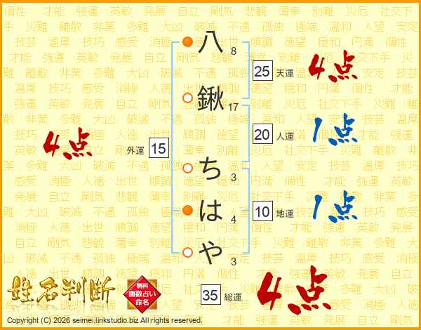 八鍬ちはやさんの総運は35画の4点!
