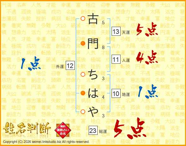 古(5画)門(8画) ち(3画)は(4画)や(3画)