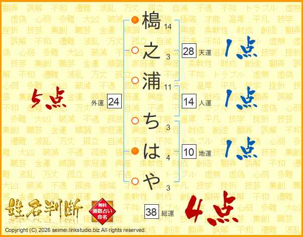 生活面を象徴する運勢です。外部から受ける影響力を表し、結婚運、家庭運や職場、環境への順応性を表します。総運から人運を引いた画数。姓や名が1文字の場合を除く。
