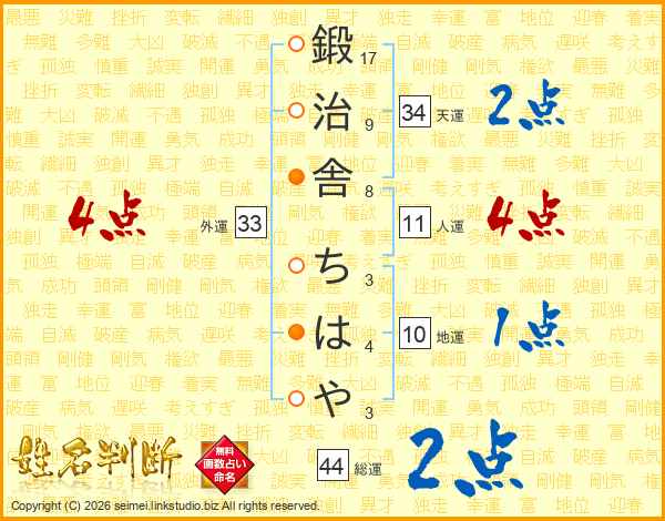 鍛(17画)治(9画)舎(8画) ち(3画)は(4画)や(3画)