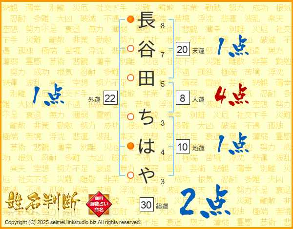 長(8画)谷(7画)田(5画) ち(3画)は(4画)や(3画)