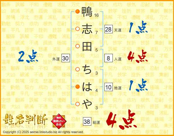鴨志田ちはやさんの総運は38画の4点!