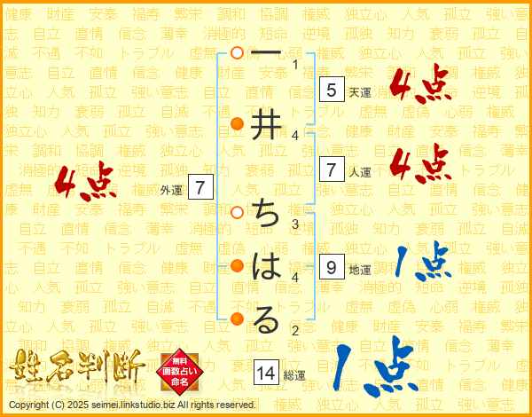 生活面を象徴する運勢です。外部から受ける影響力を表し、結婚運、家庭運や職場、環境への順応性を表します。総運から人運を引いた画数。姓や名が1文字の場合を除く。