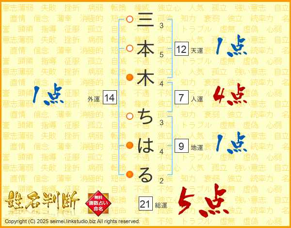 三本木ちはるさんの総運は21画の5点!