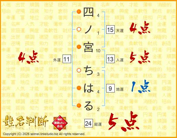生活面を象徴する運勢です。外部から受ける影響力を表し、結婚運、家庭運や職場、環境への順応性を表します。総運から人運を引いた画数。姓や名が1文字の場合を除く。