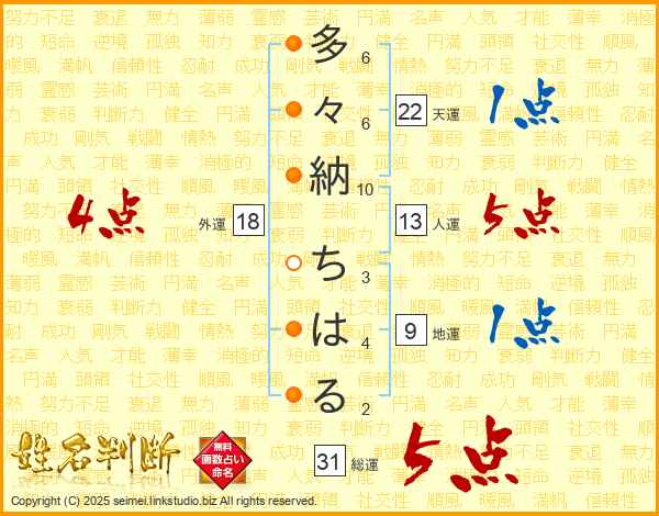 多(6画)々(6画)納(10画) ち(3画)は(4画)る(2画)