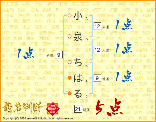 小(3画)泉(9画) ち(3画)は(4画)る(2画)