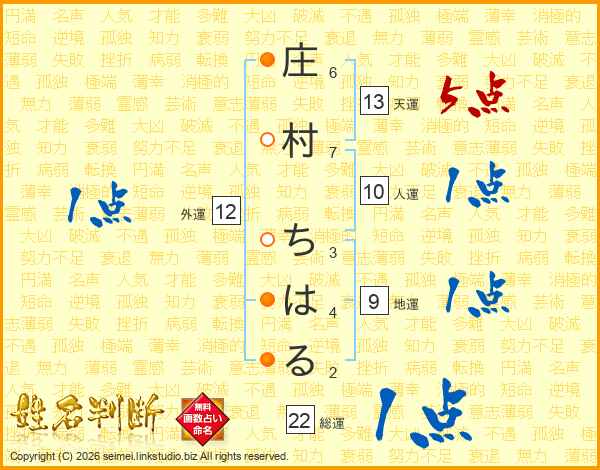 庄村ちはるさんの総運は22画の1点!