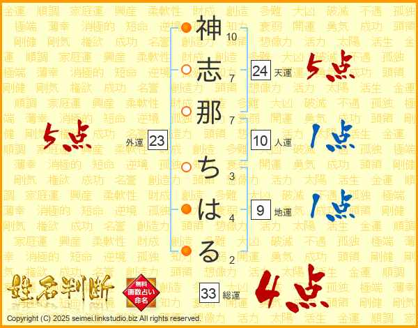 神(10画)志(7画)那(7画) ち(3画)は(4画)る(2画)