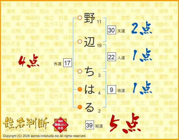 生活面を象徴する運勢です。外部から受ける影響力を表し、結婚運、家庭運や職場、環境への順応性を表します。総運から人運を引いた画数。姓や名が1文字の場合を除く。