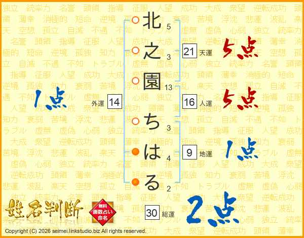 北之園ちはるさんの天運は21画の5点!