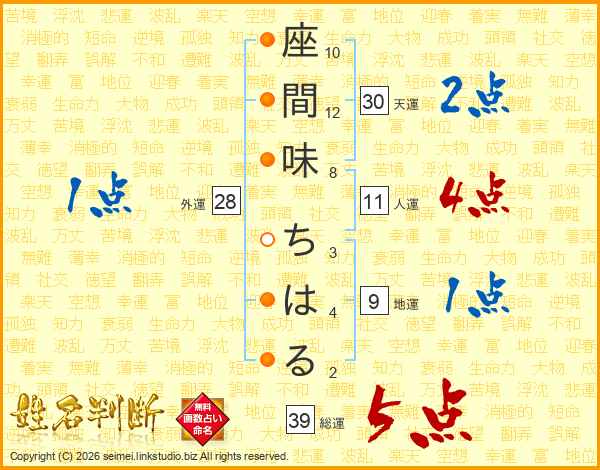 座(10画)間(12画)味(8画) ち(3画)は(4画)る(2画)