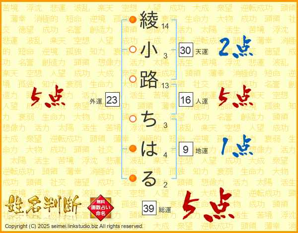 綾小路ちはるさんの総運は39画の5点!