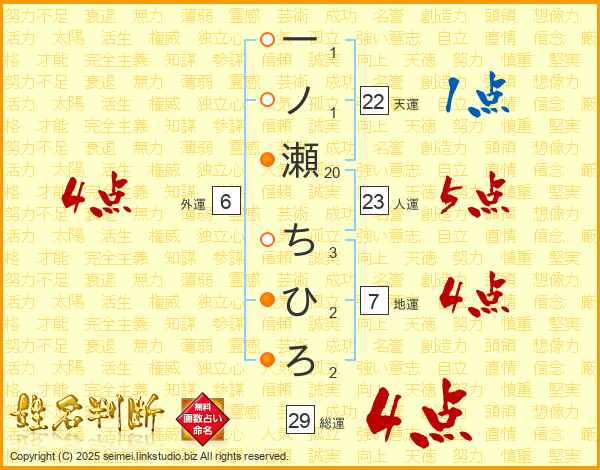 あなたの人生を表す1番重要な運勢です。生涯を通じて影響する総合運となり、主に50歳以降の晩年期に影響を及ぼします。苗字と名前の合計画数。