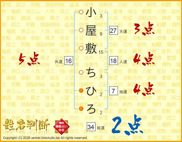 小(3画)屋(9画)敷(15画) ち(3画)ひ(2画)ろ(2画)