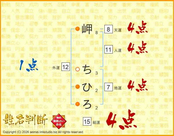 生活面を象徴する運勢です。外部から受ける影響力を表し、結婚運、家庭運や職場、環境への順応性を表します。総運から人運を引いた画数。姓や名が1文字の場合を除く。