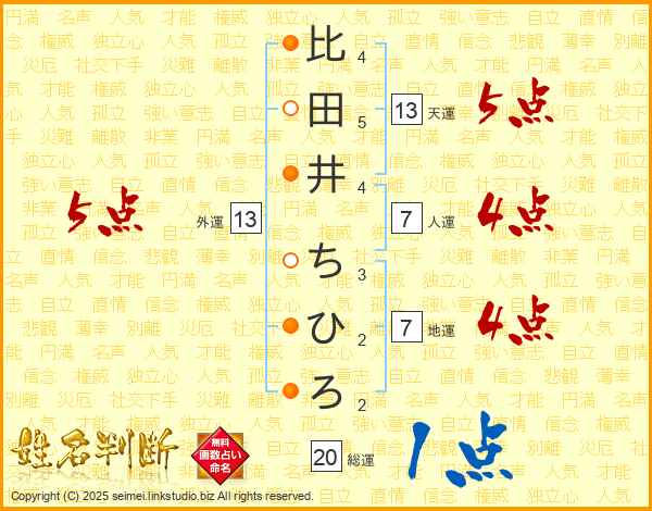 生活面を象徴する運勢です。外部から受ける影響力を表し、結婚運、家庭運や職場、環境への順応性を表します。総運から人運を引いた画数。姓や名が1文字の場合を除く。