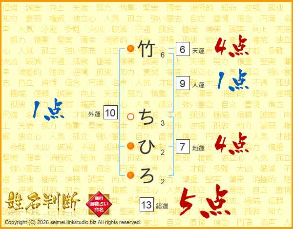 竹ちひろさんの総運は13画の5点!
