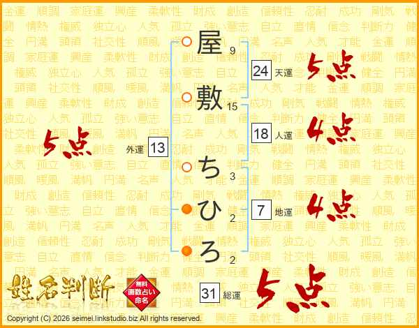屋(9画)敷(15画) ち(3画)ひ(2画)ろ(2画)