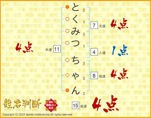 生活面を象徴する運勢です。外部から受ける影響力を表し、結婚運、家庭運や職場、環境への順応性を表します。総運から人運を引いた画数。姓や名が1文字の場合を除く。